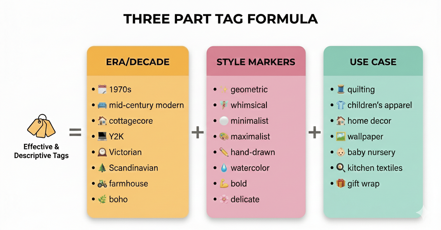 Every time you tag a pattern, run it through this three-part formula: Era/Decade + Style Markers + Use Case